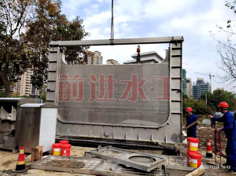 液動下開式堰門安裝步驟: (1)檢查地基尺寸,清理凹槽中的垃圾物。 (2)將底座用膨脹螺栓固定在基坑底部并校平,平面度控制在±2mm。 (3)將下開式堰門吊于底座上,用起吊裝置將堰門吊住,不讓堰門框承力。 (4)調節堰門兩側發調節螺桿,使堰門垂直,垂直度控制在±5mm內。 (5)制模板二次澆注下開式堰門,澆注要求見澆注工藝。 帶水泥凝固后才能松開起吊裝置,安裝完成。
